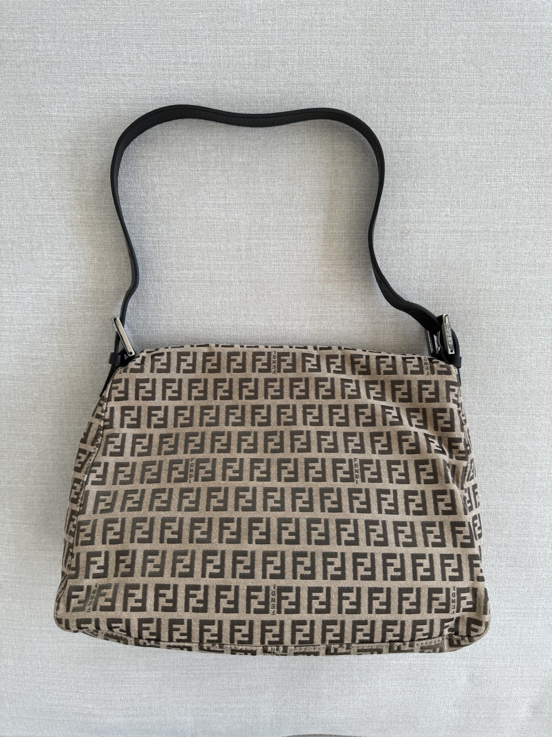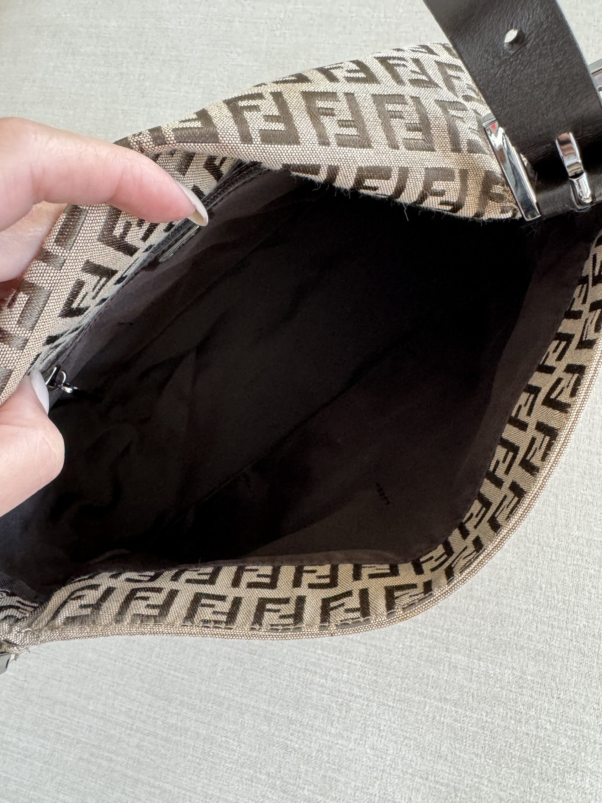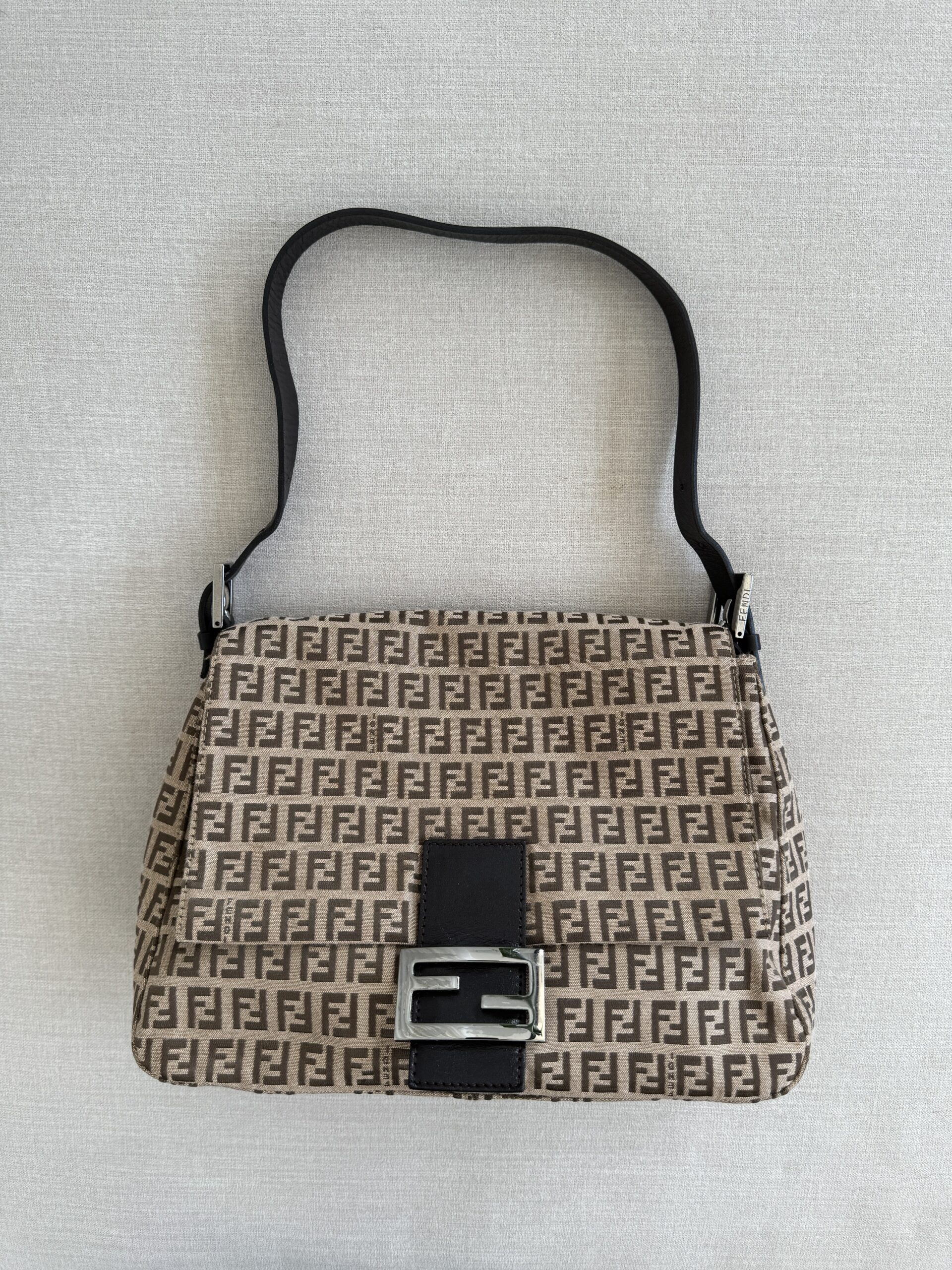 תיק כתף כתף עם הפרינט האייקוני בצבע חום מהמם בשילוב דיטיילס כסופים. התיק במצב כחדש ללא סימני שימוש הנראים לעין.