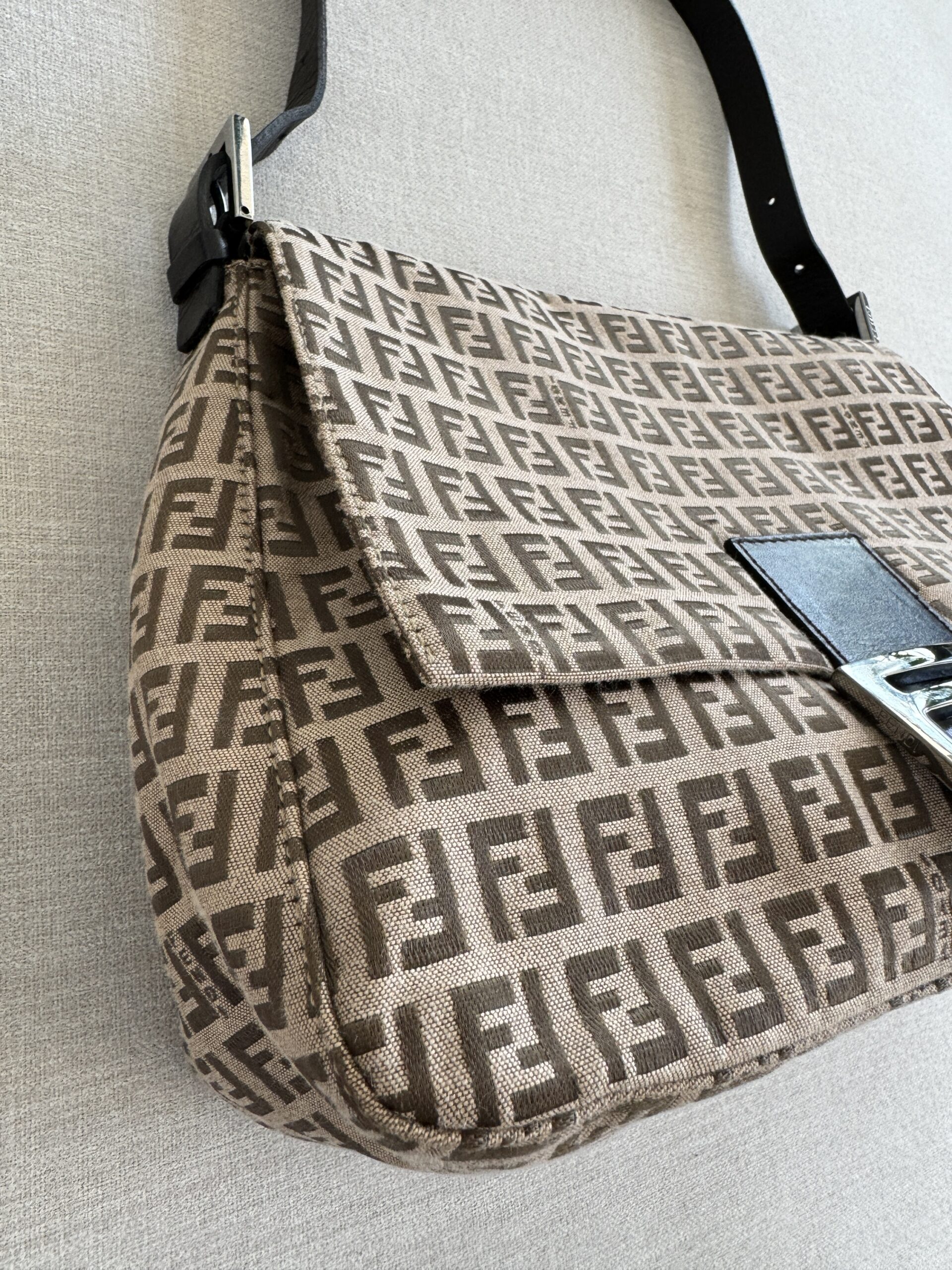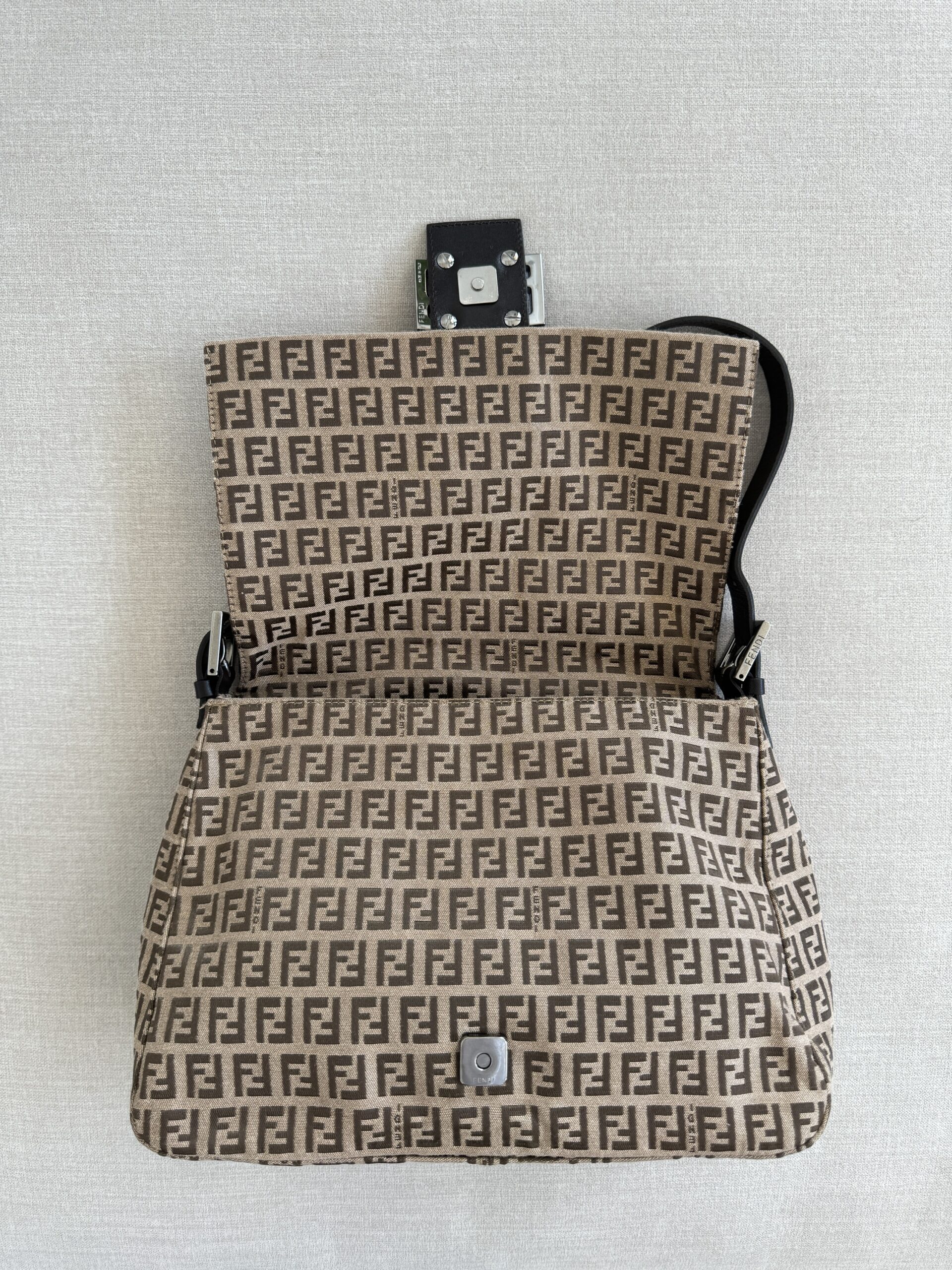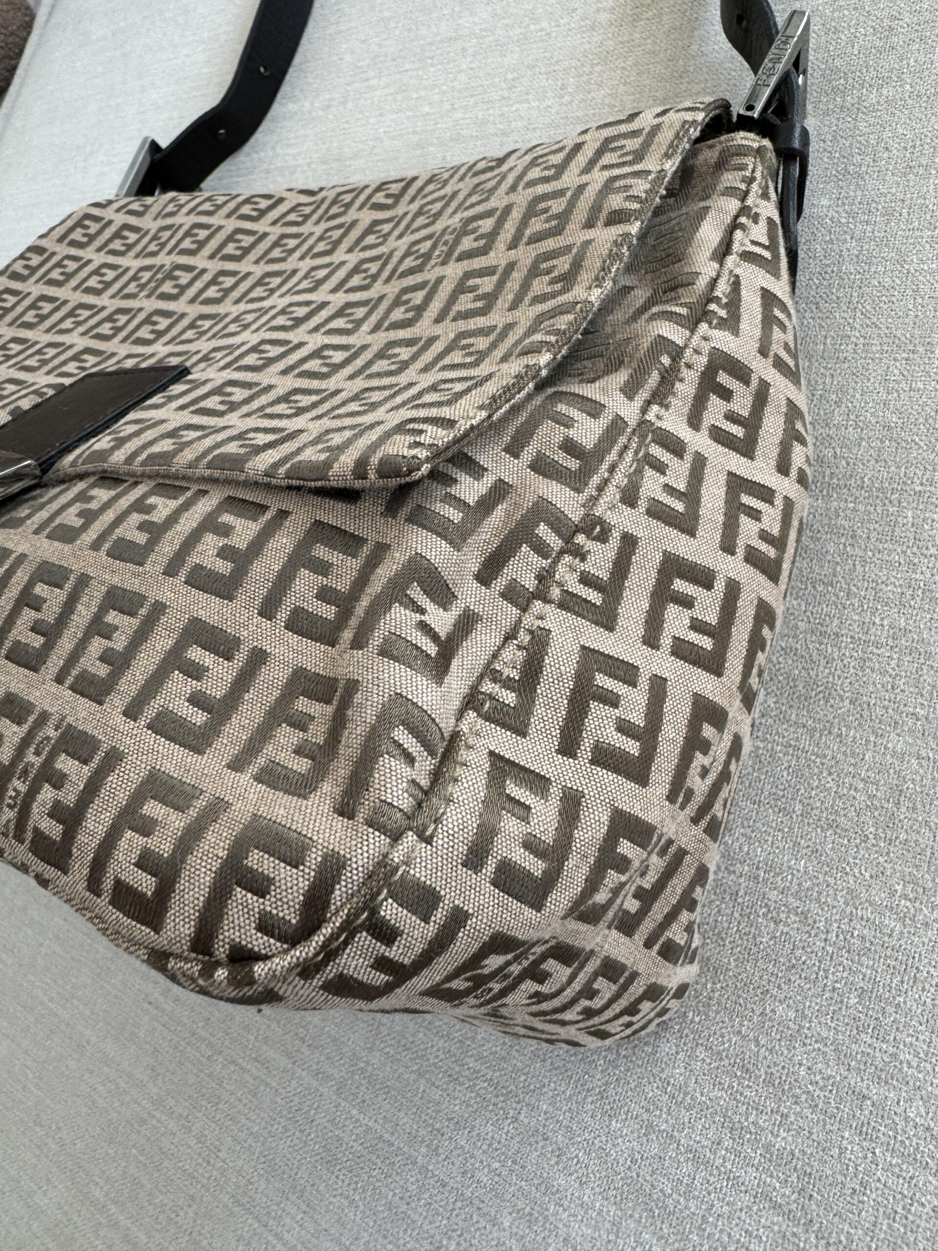 תיק כתף כתף עם הפרינט האייקוני בצבע חום מהמם בשילוב דיטיילס כסופים. התיק במצב כחדש ללא סימני שימוש הנראים לעין.